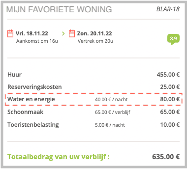 Het totale bedrag van uw verblijf wordt u in detail meegedeeld, inclusief de verschillende verplichte kosten, zoals reserveringskosten en eventuele verblijfskosten.