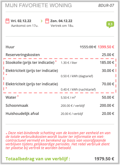 Naargelang de gekozen vakantiewoning hanteren we 2 verschillende berekeningswijzen voor de verblijfskosten.