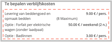 In beide gevallen kunnen “Nog te bepalen verblijfskosten” toegevoegd worden tijdens uw boeking. Deze kosten betreffen ofwel opties, ofwel kosten i.v.m. de samenstelling van uw gezelschap. Deze kosten staan beschreven onder de rubriek “Nog te bepalen verblijfskosten”. Voorbeelden: